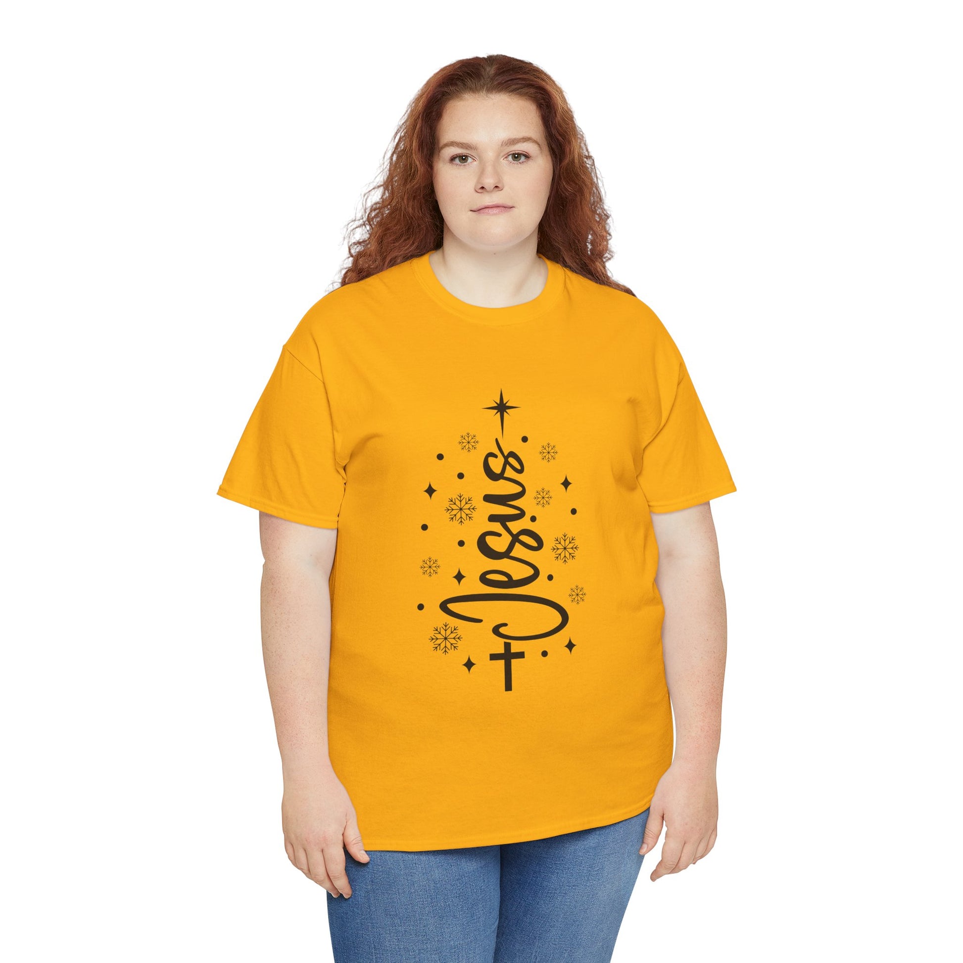 Soft, simple, and quietly expressive — this classic crew tee carries a vertical, hand-lettered 'Jesus' motif framed by tiny stars and snowflake-like sparkles. The clean, monochrome design sits along the chest for a subtle, devotional look that reads gentle and modern at once. Wear it to candlelight services, neighborhood carols, or slow mornings with coffee to bring a calm, faith-forward presence without shouting. The relaxed fit and smooth, medium-weight cotton keep the silhouette easy and wearable under jackets or on its own.